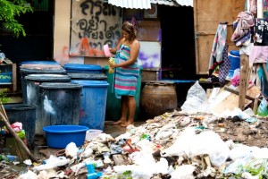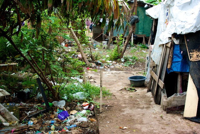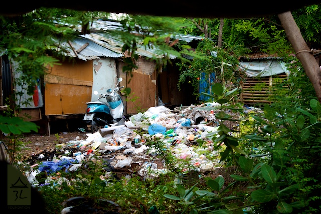 Treasure can take many forms. As Jules Verne’s Captain Nemo said in 20,000 Leagues Under the Sea, “…the greatest treasure of all is a sound mind and full belly.” Very true. But Nemo had the luxury of walking upon deck plates of his submarine of his own making. The people of the Thepprasit slum walk upon a carpet of mud and debris. So in context, we may find it strange that a simple pair of flip-flops is treasure here. A few dollars buys a lot of treasure here.