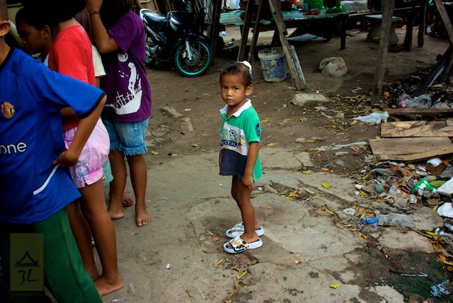 Today, Pam, Ashley and I saw this first hand. We went back to visit one of the slums in Pattaya we visited last February. Those we met today shuffle in discouragement, a battle of desperation…in bare feet. The Thep Prasit slum (pronounced ‘Tepesit’) is an enclave of impoverishment of over seventy people (at least forty of which are children), where the very environment around them exists to extinguish hope and aspiration. A dark energy that affects them so much, it demands tribute be offered to feed it. Leaching them of their will strengthens it and creates a vicious cycle of imposed imprisonment and self-imposed exile from drive to escape. The tax it exacts of a soul is that of dignity, of a body its health and clothing, of the mind is desire for salient knowledge, of the heart its desire for beauty. Here, the text adorning the gate that defines the limits of Hell in Dante’s Inferno would find a comfortable home; “Abandon all hope, ye who enter here.”